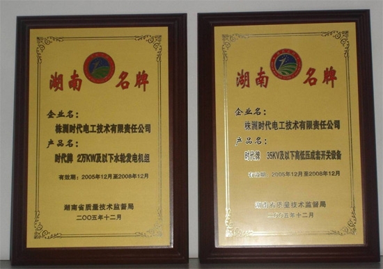 湖南省名牌产品证书(35KV以下高低压成套开关设备、2万KW以下水轮发电机组)