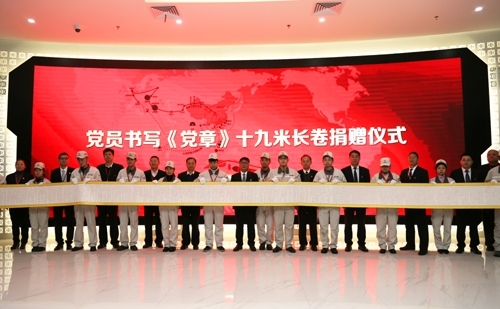 1月3日,党员书写《党章》十九米长卷捐赠仪式在公司科技文化展示中心举行。公司党委书记、董事长周清和从一名普通党员手里接到一份献给党的特殊礼物——“19米长的手抄版党章”。仪式由公司党委副书记、纪委书记、工会主席刘志平主持。相关单位党政负责人及党员代表参加仪式。
